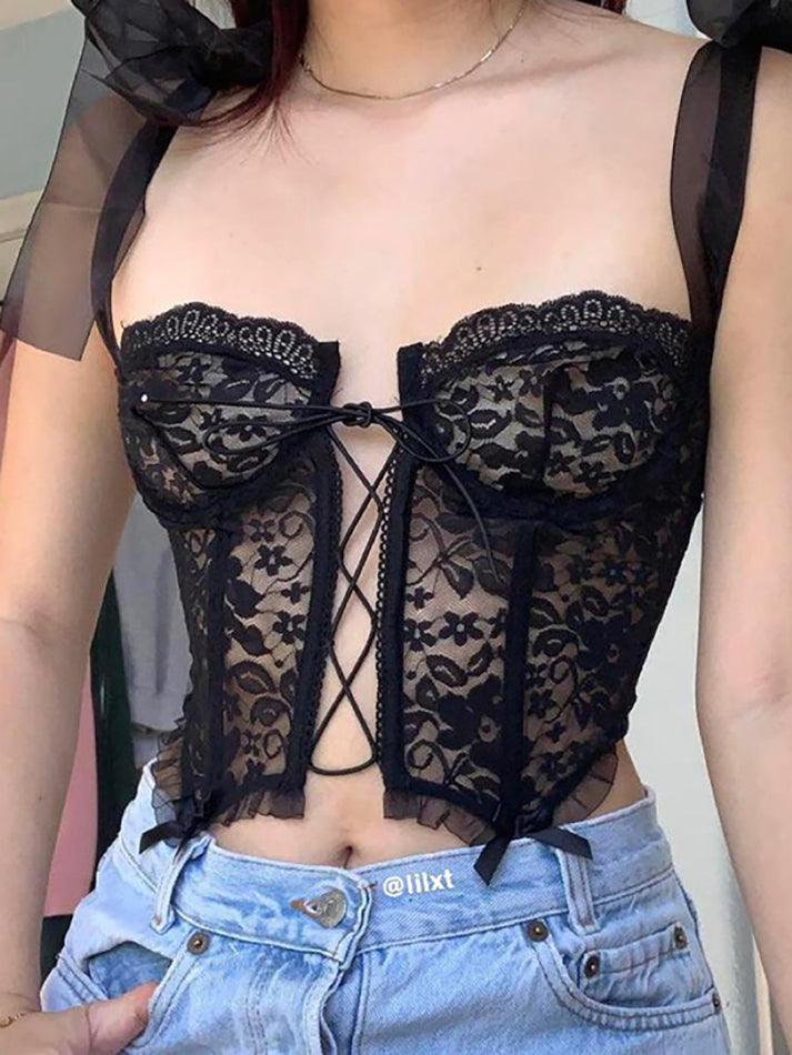 Description: Embrace your inner allure with our Sexy Strap Lace-Up Mesh Corset Top. Crafted from semi-sheer lace fabric. this top features adjustable tie-up shoulder straps and a seductive tie front fastening. The irregular hem with frill mesh trim adds a touch of playfulness to your look. Perfect for a night out or a special occasion. this top is designed to enhance your confidence and turn heads wherever you go.