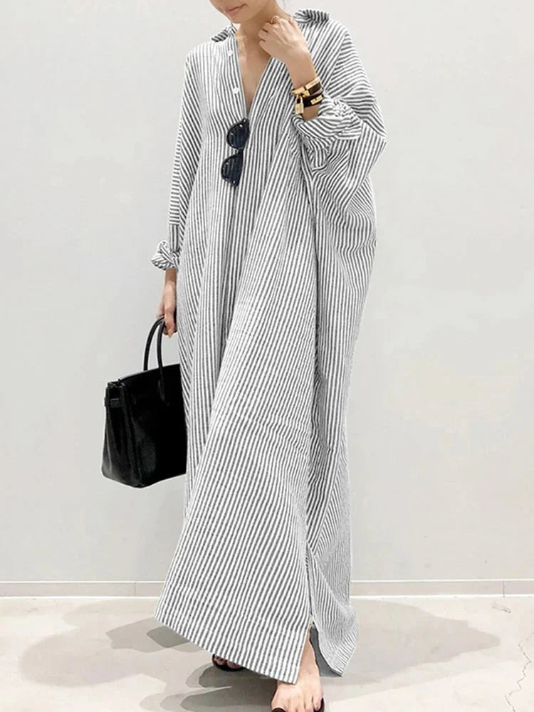 Embrace relaxed style with this stripe printed casual loose dress. Featuring a turn-down collar. button decoration. and an ankle-length straight silhouette. this dress offers a comfortable fit with non-stretch cotton blend fabric. Perfect for effortless everyday wear.