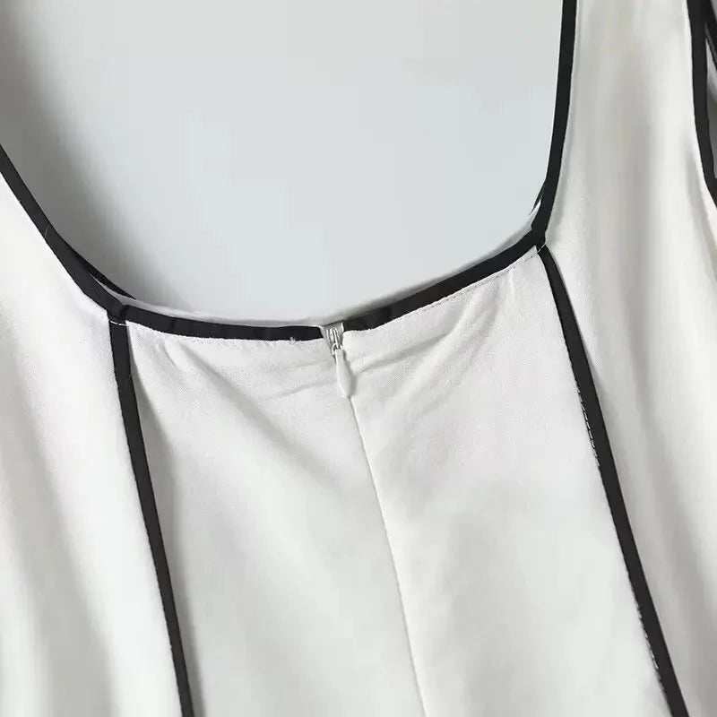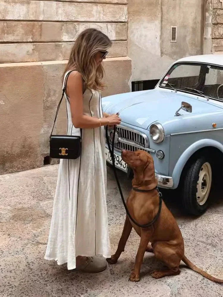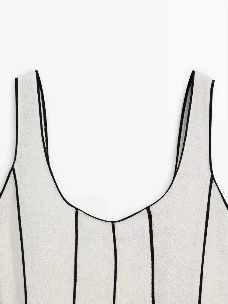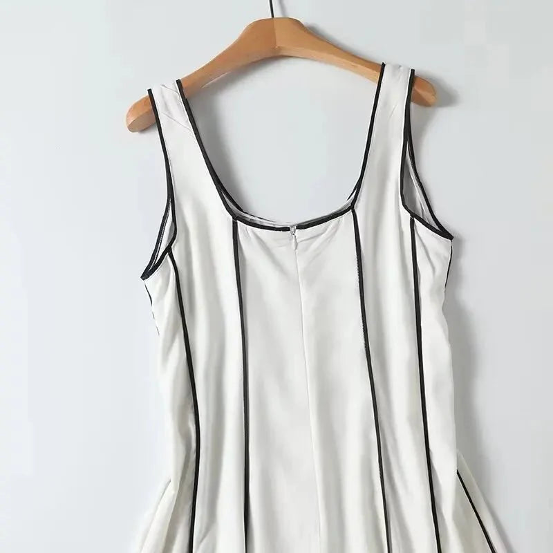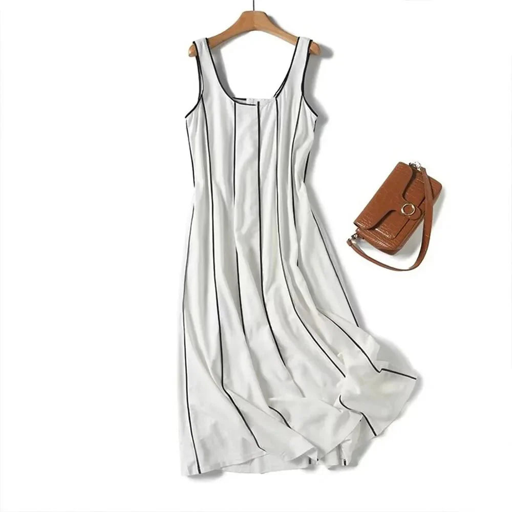 Design: A casual sleeveless dress featuring bold striped patterns and a flattering U-neckline. The mid-calf length and A-line silhouette create an effortlessly chic and breezy look.