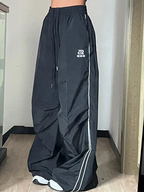 Description: These girls parachute style pants are retro and sporty. Cuts to a super relaxed silhouette. they have a drawcord tie waist style. features contrast piping details along the side. with front side pockets. and has a logo detail on it.
