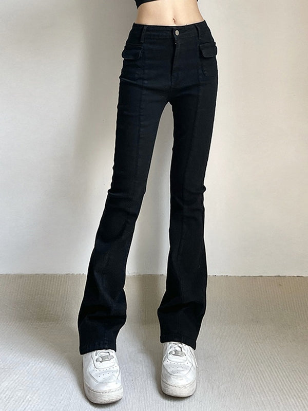 Description: These dark washed denim jeans shaped to a slim flare-leg silhouette. features flap pockets to the front. and has classic belt loops design. ended with a metal button zip fly.