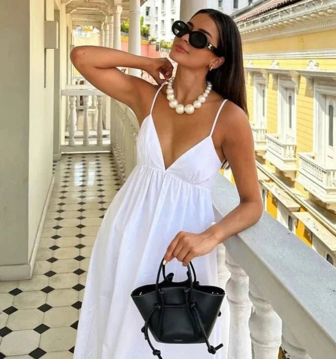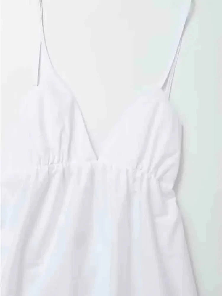 Design: Step into effortless elegance with this V-Neck Spaghetti Strap Dress. Featuring a sleek backless design. slim fit. and flattering fit & flare silhouette. this ankle-length dress exudes modern streetwear charm. The delicate spaghetti straps add a touch of allure. making it a must-have for your wardrobe.