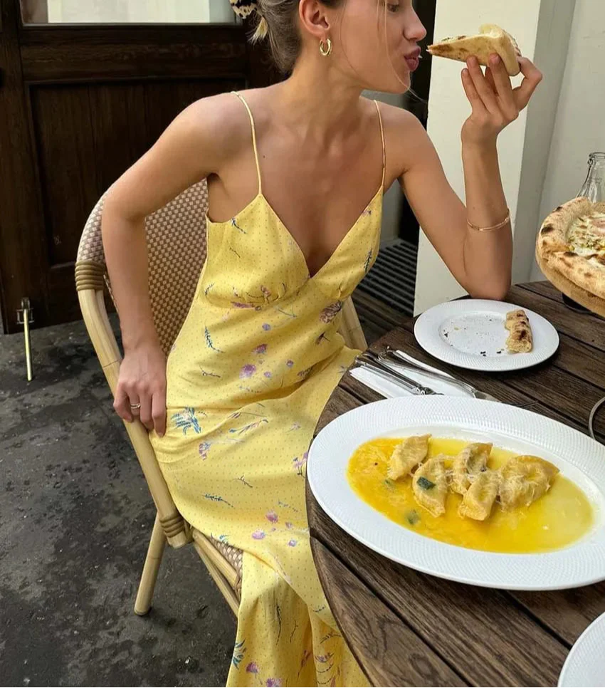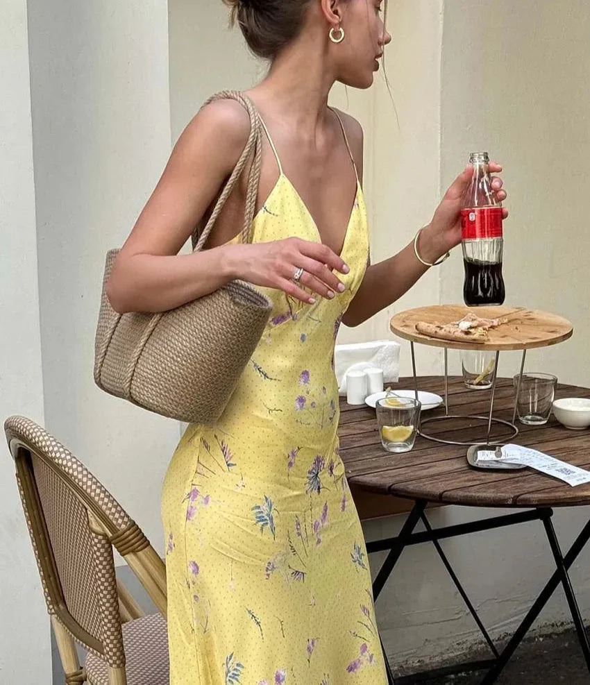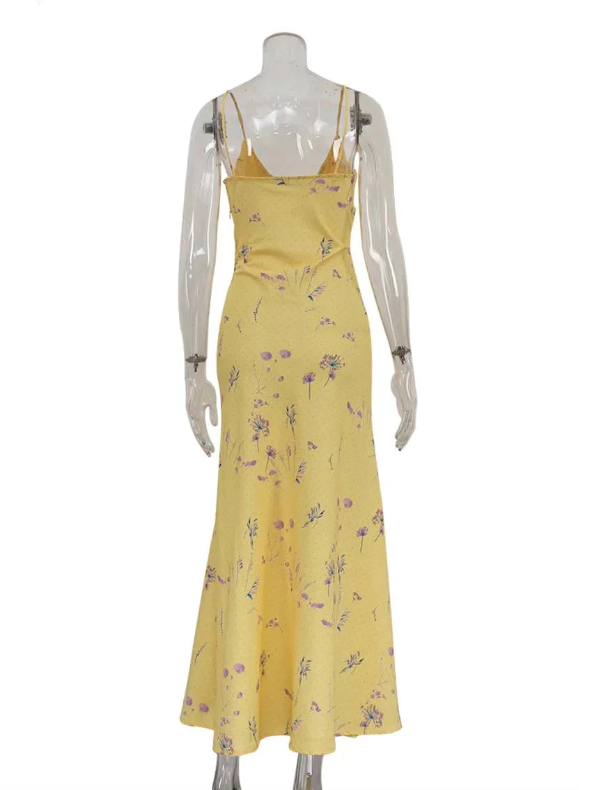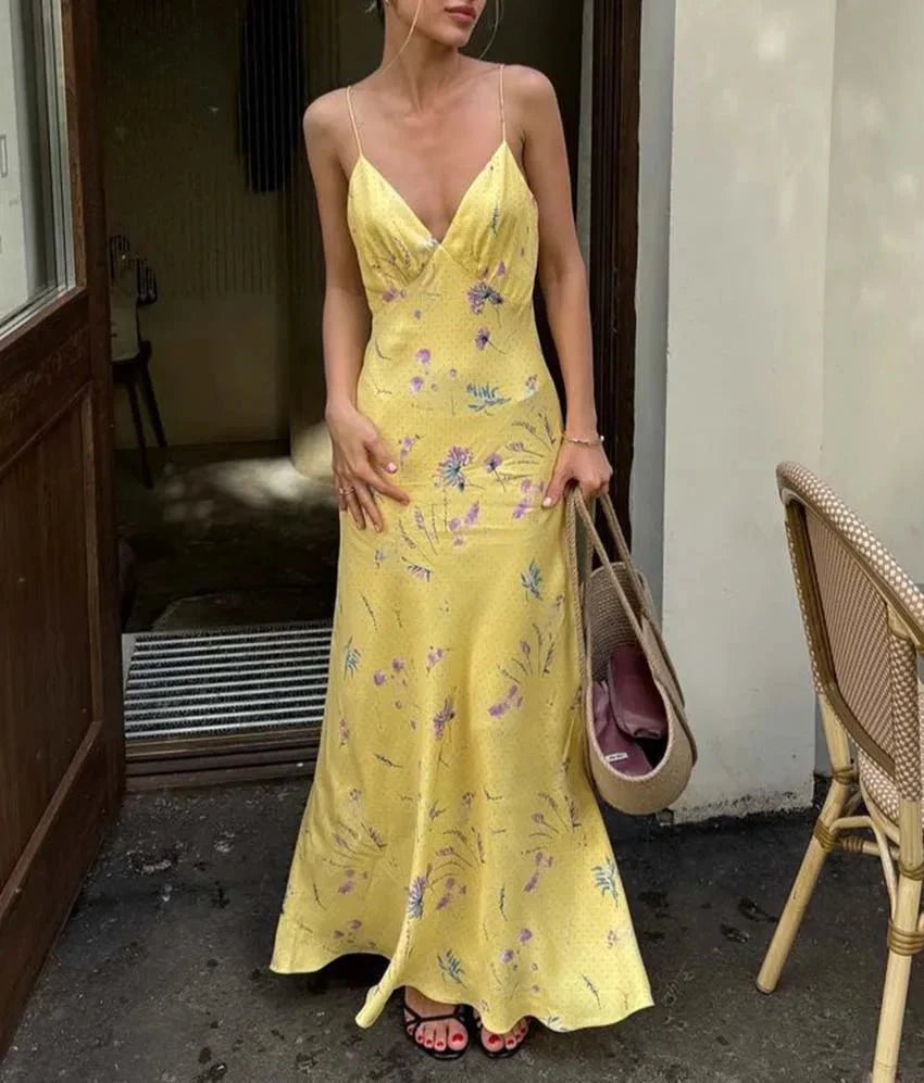 Design: Elegant ankle-length dress featuring a vibrant yellow print. V-neckline. and slim spaghetti straps. The straight silhouette offers a sleek. flattering look perfect for effortless autumn style.